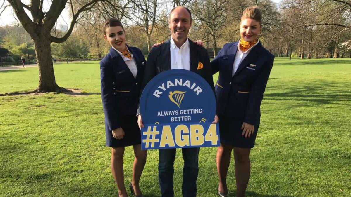 El director de marketing de Ryanair, Kenny Jacobs, posa con dos tripulantes de vuelo con el logo de la cuarta fase del programa 'Siempre mejorando'.Foto: atlas