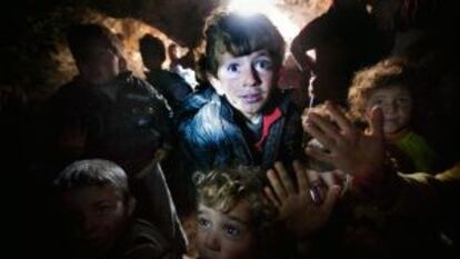 5 de enero de 2013, lugar secreto en la provincia de Idlib, noroeste de Siria. Un grupo de niños viven y se esconden, junto con sus mayores, en cuevas en la provincia de Idlib. Cuando se tomó esta foto no se veían colchones, y los refugiados no tenían suficiente comida, ni medicinas, ni ropa para el duro frío del invierno, aunque al menos los niños sí recibían clases de profesores voluntarios. Desde el inicio de la guerra, unos 4,5 millones de personas han sido desplazadas y más de 1,5 millones de sirios se han refugiado en otros países. Más de la mitad de los desplazados son niños. Suponen la cuarta parte de la población siria, de más de 22 millones de personas.