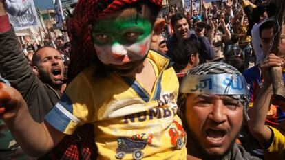 23 de marzo de 2012, Binnish, provincia de Idlib, noroeste de Siria. Como cada viernes, cerca de mil personas se manifiestan contra el régimen. En esta ocasión lo hacen bajo el lema: “¡Damasco, allá vamos!”. Movilizaciones anteriores habían sido más multitudinarias, pero Binnish había sido bombardeada el día anterior y la gente tenía miedo y se marchaba de la ciudad. Entonces se cumplía un año del inicio de la guerra y habían muerto unas 9.000 personas. Hoy, los muertos son más de 100.000, la contienda continúa y los rebeldes no han entrado en Damasco. Desde el primer momento, los niños estuvieron muy presentes en las protestas. El pequeño que está en primer plano tiene la cara pintada con la antigua bandera siria de la independencia, de franjas, verde, blanca y negra, con tres estrellas rojas en el centro. La oposición al régimen del presidente Bachar el Asad volvió a adoptarla a finales de 2011, y para muchos es la bandera de la revolución.