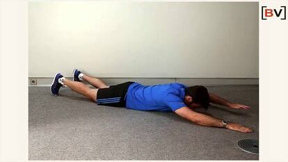 De nuevo tumbado boca abajo, extienda los brazos por encima de la cabeza. Separe un brazo del suelo y haga lo mismo con la pierna contraria, a la vez que intenta alargarlos todo lo posible. Mantenga esta posición durante cinco segundos. Cambie de lado y repita el ejercicio. Ejercite cada lado cinco veces.