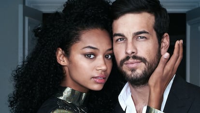 Mario Casas y Berta Vázquez –conocida por su papel en la serie Vis a vis– no se exponen tanto a la clientela del hotel. Ambos posan en el rincón de uno de los pasillos, plagados de espejos. Mario –que debutó en la gran pantalla de la mano de Antonio Banderas con El camino de los ingleses– se mira en ellos cada vez que pasa por delante, recreándose en su imagen de galán. Discretos y elegantes. La conexión entre ambos parece íntima y delicada. Intercambian susurros entre flases. “Así, pon esa mirada de Marlon Brando”, le piden. Mario ríe. “Me dicen mucho eso, todos los días”, bromea. La última de las conexiones, la de Arnaud Maillard y Álvaro Castejón, es equilibrada. Álvaro tiene la tranquilidad del agua. Observa recostado sobre el respaldo del sillón. Arnaud, la fuerza del aceite hirviendo. Se inclina hacia delante. Sus ojos emiten chispazos. Los diseñadores son los últimos en dejar atrás el rimbombante lujo del hotel madrileño. Ya nadie hace flexiones con traje de gala. Ni se escuchan espinosas conversaciones de política catalana por los pasillos, ahora en silencio. Por ellos solo deambula aquel empleado a quien parece aterrar la sola idea de que le interpelen en castellano.