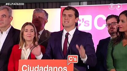 Albert Rivera, líder de Ciudadanos, se ha dirigido a sus seguidores en el hotel Eurobuilding de Madrid: "Hoy España empieza una etapa de esperanza e ilusión", ha señalado mientras lo interrumpían con aplausos. "Millones de españoles han decidido que este país va a cambiar". Rivera ha lanzado mensaje de consenso al resto de fuerzas políticas y ha afirmado que sus 40 diputados "hombres y mujeres", "van a pensar más en España que en nuestro partido". "¿Os acordáis de dónde estábamos hace un año?", ha dicho, refiriéndose al ascenso de su partido al presentarse para concurrir en toda España, a su juicio, "un paso de gigante". Ha continuado diciendo que "el centro político de España a partir de ahora se llama Ciudadanos" y se ha referido a un "cambio de la Ley Electoral" a partir de mañana, lunes.