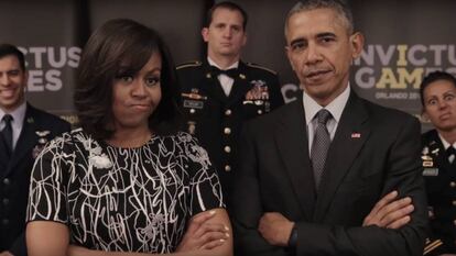 En el vídeo, distribuido por la cuenta oficial de la Casa Blanca en Youtube, el presidente de Estados Unidos y la primera dama aparecen respaldados por un grupo de hombres y mujeres aparentemente listos para "la batalla" en los juegos que comienzan el próximo 8 de mayo.