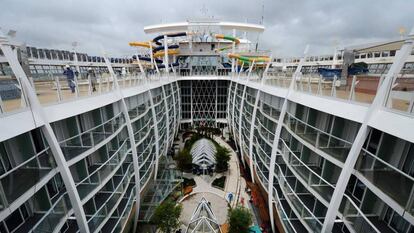 361 metros de eslora, 60.000 toneladas de acero, 6.360 pasajeros, 2.100 tripulantes… Son las mastodónticas cifras del Harmony of the Seas. El crucero más grande del mundo ha sido entregado esta semana a Royal Caribbean en Saint Nazaire (Francia) tras 32 meses de trabajos. En ese tiempo, casi 2.500 empleados del astillero STX y sus subcontratas han invertido 10 millones de horas en la construcción del barco. A cambio, la naviera estadounidense ha pagado cerca de 1.000 millones de euros. Y por eso muestra orgullosa en su canal de vídeo a la nueva estrella de la flota: un paseo de un minuto por una obra de ingeniería cuyos números ya marean antes de montar a bordo.