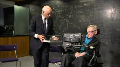 “Es la primera vez que se reconoce mi investigación en el área de formación de galaxias". Así agradeció el físico teórico británico Stephen Hawking su premio Fundación BBVA Fronteras del Conocimiento en la categoría de Ciencias Básicas que comparte con su colega ruso Viatcheslav Mukhanov. El galardón se lo ha entregado esta semana en el Centro de Estudios Matemáticos de la Universidad de Cambridge (Reino Unido) el presidente de la Fundación BBVA, Francisco González.