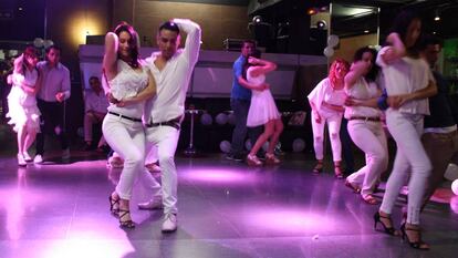 Aurelie Ortz tiene 24 años, es belga y está nerviosa porque es la primera vez. Se mira en el espejo y no deja de mirarse los pies. La música comienza a sonar y no sabe dónde colocar las manos. "Uno, dos, tres, básico, giro y chachachá", grita el profesor. El tiempo pasa, los músculos se relajan, se forman las parejas de baile y el ritmo fluye. Acaba de comenzar una nueva clase de baile latino, música que en menos de cinco años se ha convertido en parte de la banda sonora de Madrid. La ciudad cuenta con más de 30 salas de baile enfocadas a diferentes estilos de música latina. Además de ser la capital de España, Madrid también es la capital mundial de la salsa, la bachata e incluso del perreo.