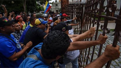 But the worst incidents took place inside the protocol room, where the former Senate used to be housed. Manuel Rojas Pérez, an opposition representative for the municipality of Chacao, told EL PAÍS that the crowd assaulted the people inside the room. Insults and blows were exchanged, and chairs pushed out of balconies.
