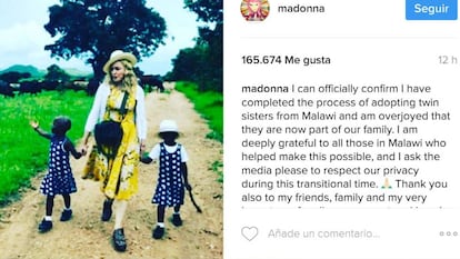 Madonna ha confirmado este miércoles en las redes sociales que acaba de adoptar a dos gemelas en Malaui. La cantante, de 58 años, ha recibido el visto bueno de la Corte Suprema de Malaui, según ha contado ella misma a través de Instagram y ya había anunciado el portavoz de este organismo MLenga Mvula. La leyenda del pop ha publicado en esta misma red social una imagen en la que se la ve paseando por un camino rural de la mano de las dos niñas, que llevan el mismo vestido de color azul y blanco. "Estoy profundamente agradecida a todas las personas que han hecho que esto sea posible en Malaui. Pido a los medios de comunicación que respeten nuestra privacidad durante este periodo de transición", ha añadido en su mensaje de Instagram.