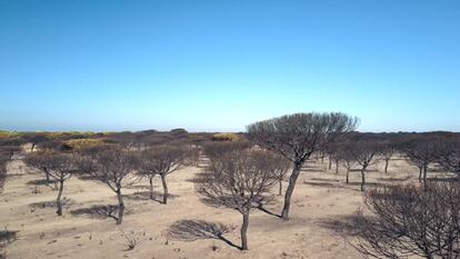 Imágenes captadas por un dron muestran los daños causados por el incendio en el entorno del Espacio Natural de Doñana. Entre los destrozos se pueden ver lo terrenos cubiertos de cenizas salpicados de pinos negros despojados de sus copas. La ministra de Agricultura y Pesca, Alimentación y Medio Ambiente, Isabel García Tejerina, ha considerado que la evolución actual del incendio declarado el sábado pasado en Moguer (Huelva) es "favorable" y ha confiado en que "en el menor tiempo posible se pueda tener controlado". Más de 200 efectivos acompañados de medios aéreos trabajan en combatir las llamas en las zonas afectadas y a pie 244 soldados enviados por la Unidad Militar de Emergencia (UME) realizan labores con 12 autobombas, y que ha obligado a desalojar a más de 2.000 personas.