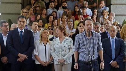 Las principales fuerzas políticas escenificaron este viernes unidad contra el terrorismo y lanzaron un mensaje unánime de solidaridad a Francia tras el atentado de Niza. El breve acto celebrado en el Congreso tras un minuto de silencio ofreció una insólita imagen en la que todos, desde el socialista Pedro Sánchez a Pablo Iglesias, aplaudieron las palabras de todos. Aun así, tras el Consejo de Ministros, la vicepresidenta en funciones, Soraya Sáenz de Santamaría, llamó la atención al líder de Podemos por expresar críticas a la estrategia antiyihadista de Europa.