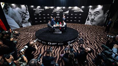 Las aguas del río Ishim se veían heladas desde el lujoso hotel Saint Regis en Astaná, sede del duelo. Pero las cabezas de los dos gladiadores mentales ya quemaban desde que llegaron al escenario. Niepómniashi, diez minutos antes de la hora, traje gris y camisa rosa oscuro; Ding, tres minutos después, traje azul marino y camisa blanca; ambos sin corbata. Aunque ponía cara de póquer, un gesto contra la etiqueta delató la tensión nerviosa del chino: se quitó la chaqueta antes de que el ministro de Deportes, Asjat Orálov, y el presidente de la Federación Internacional de Ajedrez (FIDE), el ruso Arkady Dvorkóvich, hicieran el saque de honor. Niepómniashi, con la experiencia del duelo que perdió ante el todavía campeón, el noruego Magnus Carlsen (Dubái, 2021), parecía más tranquilo.