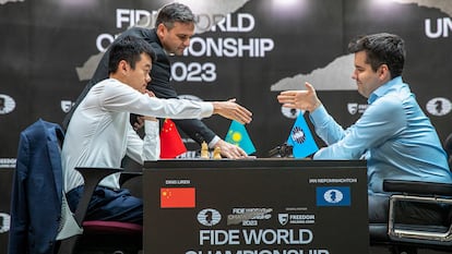 Un empate agotador, tras seis horas y 35 minutos, clausuró las catorce partidas lentas (7-7) previstas en el Mundial de ajedrez de Astaná (Kazajistán). El ruso Ian Niepómniashi y el chino Liren Ding se jugarán este domingo la sucesión del campeón vigente, el noruego Magnus Carlsen, en cuatro partidas de 25 minutos por bando (más diez segundos de incremento tras cada lance). Si persiste el empate, seguirán luchando al modo relámpago (dos partidas de cinco minutos más tres segundos), hasta llegar eventualmente a la muerte súbita (una sola partida con tres minutos y dos segundos, hasta que alguien gane).