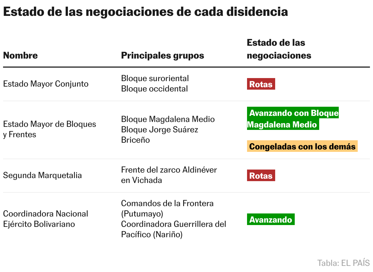 Tras el acuerdo de paz de 2016, ha surgido un rompecabezas de facciones que reivindican el nombre de la extinta guerrilla. Dos de las cuatro sombrillas mantienen mesas de negociación activas