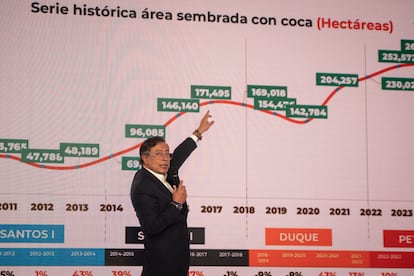 El otro dato clave que revela la UNODC, el de las hectáreas sembradas, no está en disputa. Esa cifra tampoco ha dejado de aumentar con Petro, aunque su ritmo de crecimiento se ha desacelerado en el último lustro. En 2021, el crecimiento fue del 43%, al año siguiente del 13% y en 2023 del 10%, hasta las 253.000 hectáreas. El informe correspondiente a 2024, que tendría que haberse publicado para esta fecha, está frenado porque el Gobierno, ahora sí, está discutiendo la metodología con la UNODC. De momento, no hay una fecha fijada para su publicación. Sin embargo, el presidente ha adelantado que el crecimiento de los cultivos fue de poco más del 3%, hasta las 261.000 hectáreas.