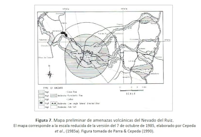 La primera señal de alarma del Ruiz, más de un siglo después de su última erupción, fue un sismo en diciembre de 1984. Cortés cuenta que unos montañistas comenzaron a advertirle a sus profesores de cambios llamativos en la cima del nevado: gases amarillentos, alteraciones en la coloración de la nieve, ruidos fuertes. “Empezamos a recibir visitas importantes de geólogos extranjeros, que dijeron que había que iniciar un monitoreo y elaborar un mapa de amenaza”, relata Cortés en una videollamada desde el Observatorio Vulcanológico y Sismológico de Manizales, a una treintena de kilómetros de la cumbre nevada. En julio de 1985, las autoridades instalaron cuatro medidores de sismos en el volcán. En septiembre, la preocupación aumentó tras una primera erupción que, aunque pequeña y sin expulsión de magma, cubrió de cenizas a la ciudad de Manizales. Unas semanas después, se publicó un mapa que identificaba las zonas de riesgo, entre las que se encontraba Armero.