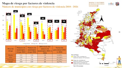 De cara a las elecciones nacionales de 2026, de los 1.100 municipios que tiene Colombia, hay 170 con algún nivel de riesgo electoral donde coinciden factores indicativos de fraude y de violencia, ha explicado la MOE al presentar este miércoles su tradicional libro de Mapas y Factores de Riesgo Electoral 2026, que reúne el trabajo de 37 investigadores y profesores procedentes de 17 instituciones, entre universidades, centros de pensamiento, observatorios y organizaciones no gubernamentales especializadas. De estos 170 municipios, 81 están en riesgo extremo, 51 en riesgo alto y 38 en riesgo medio, detalla el estudio. Es un notable incremento con respecto a las elecciones de 2022, cuando se registraron 131 municipios en riesgo por coincidencia de factores indicativos de fraude y violencia, de acuerdo con la metodología de la MOE. Los de riesgo extremo pasaron de 49 hace cuatro años, a 81 para este ciclo electoral.