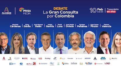 Los nueve candidatos de la Gran Consulta por Colombia se enfrentan este martes en un debate organizado por Alianza Aliadas y por Prisa Media. Mauricio Cárdenas, Vicky Dávila, Juan Manuel Galán, Juan Carlos Pinzón, Paloma Valencia, Aníbal Gaviria, David Luna y Juan Daniel Oviedo exponen las propuestas con las que esperan vencer en las votaciones del 8 de marzo próximo, cuando se elegirá a un candidato único para la primera vuelta de las elecciones en mayo. La periodista Diana Calderón, directora de Hora 20 de Caracol Radio, moderará el debate, en el que se hablará de temas como empleo, seguridad, orden público o relaciones internacionales.