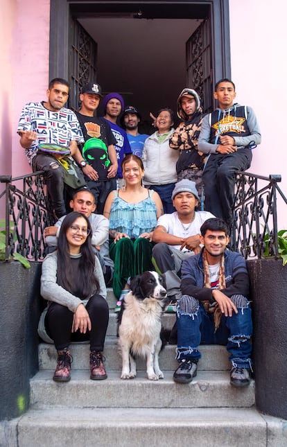 En 2019, después de años de un proceso personal de perdón y liberación, llegó a la que hoy es la casa rosada. Sin muchos recursos aterrizó en el barrio Santa Fe, una zona vulnerable de prostitución, microtráfico, delincuencia e inseguridad en el centro Bogotá. “El día que encontré la casa entendí que estaba entrando a otro portal”, recuerda. Se mudó para abrir un café y una biblioteca para niños, que a los pocos meses transmutó en un laboratorio de moda, después de aguzar el ojo para entender a su nueva comunidad. Recordó las clases que había dado a personas en contextos similares junto con el Idipron, el Instituto Distrital para la Protección de la Niñez y la Juventud de Bogotá. Desempolvó las máquinas de coser que tenía guardadas, pues creyó que su etapa de diseñadora se había ido con Catalina Azuero y el cierre de su showroom en el norte de Bogotá. Inauguró las noches de los lunes, cuando a las 9 p.m invita a entrar a los habitantes asiduos de los andenes cercanos que fueron aprendiendo a bordar.