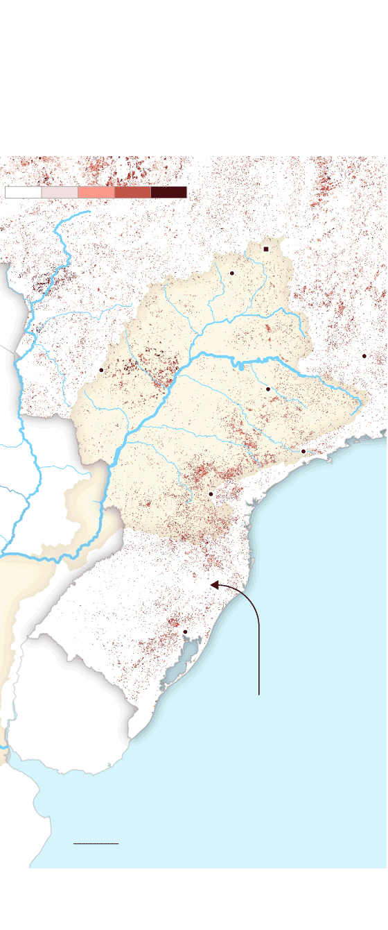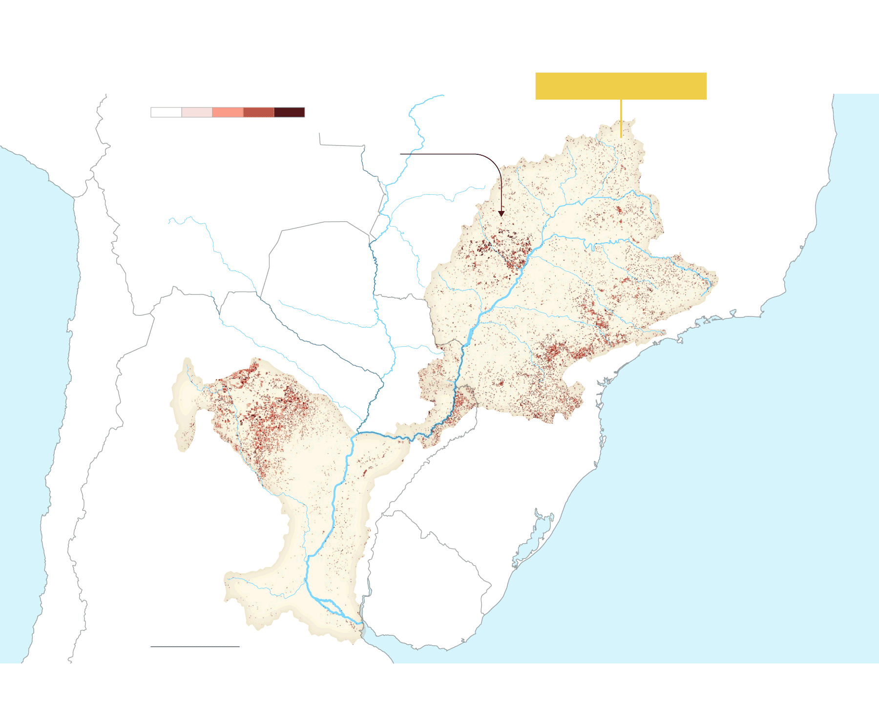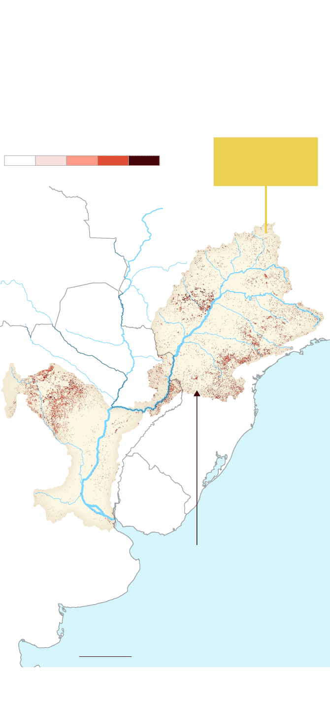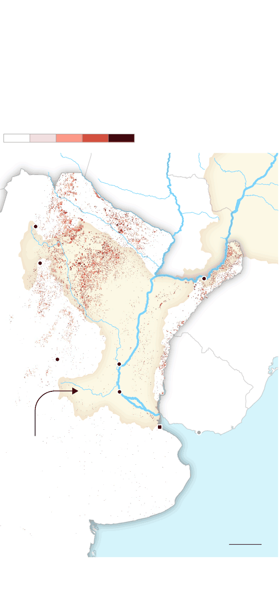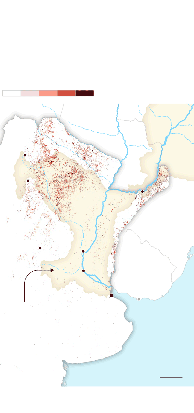 La mancha de la frontera agropecuaria en la cuenca ha alcanzado niveles históricos. Comenzó a expandirse alrededor de 1960 y sigue creciendo sin parar. Hoy es un inmenso espacio de más de 47 millones de hectáreas de agricultura extensiva y al menos 90 millones de hectáreas de pastura de ganado vacuno que ocupan partes de 11 provincias argentinas, siete estados brasileños y ocho departamentos paraguayos. La mayor pérdida de cobertura forestal fue antes de 2001, pero después de ese año, la deforestación continuó imperturbable pese a los discursos y a las políticas globales para frenarla y para disminuir la emisión de gases de efecto invernadero que aumentan la temperatura del planeta.