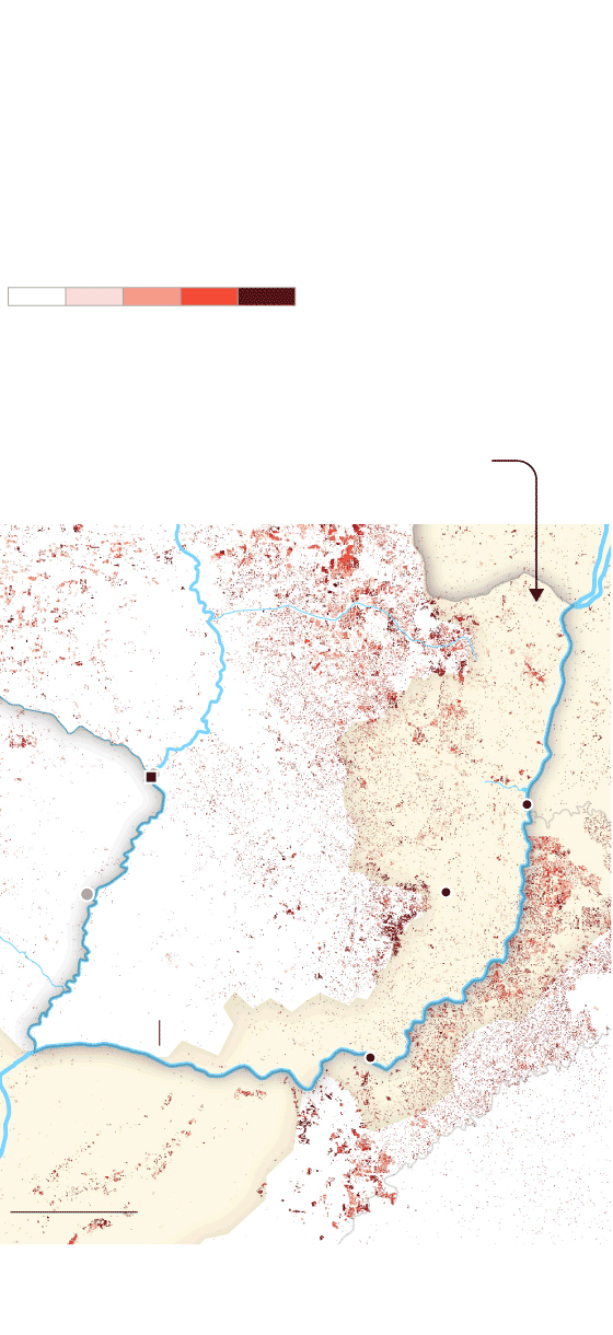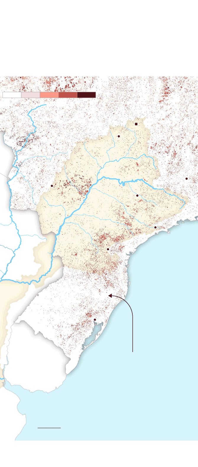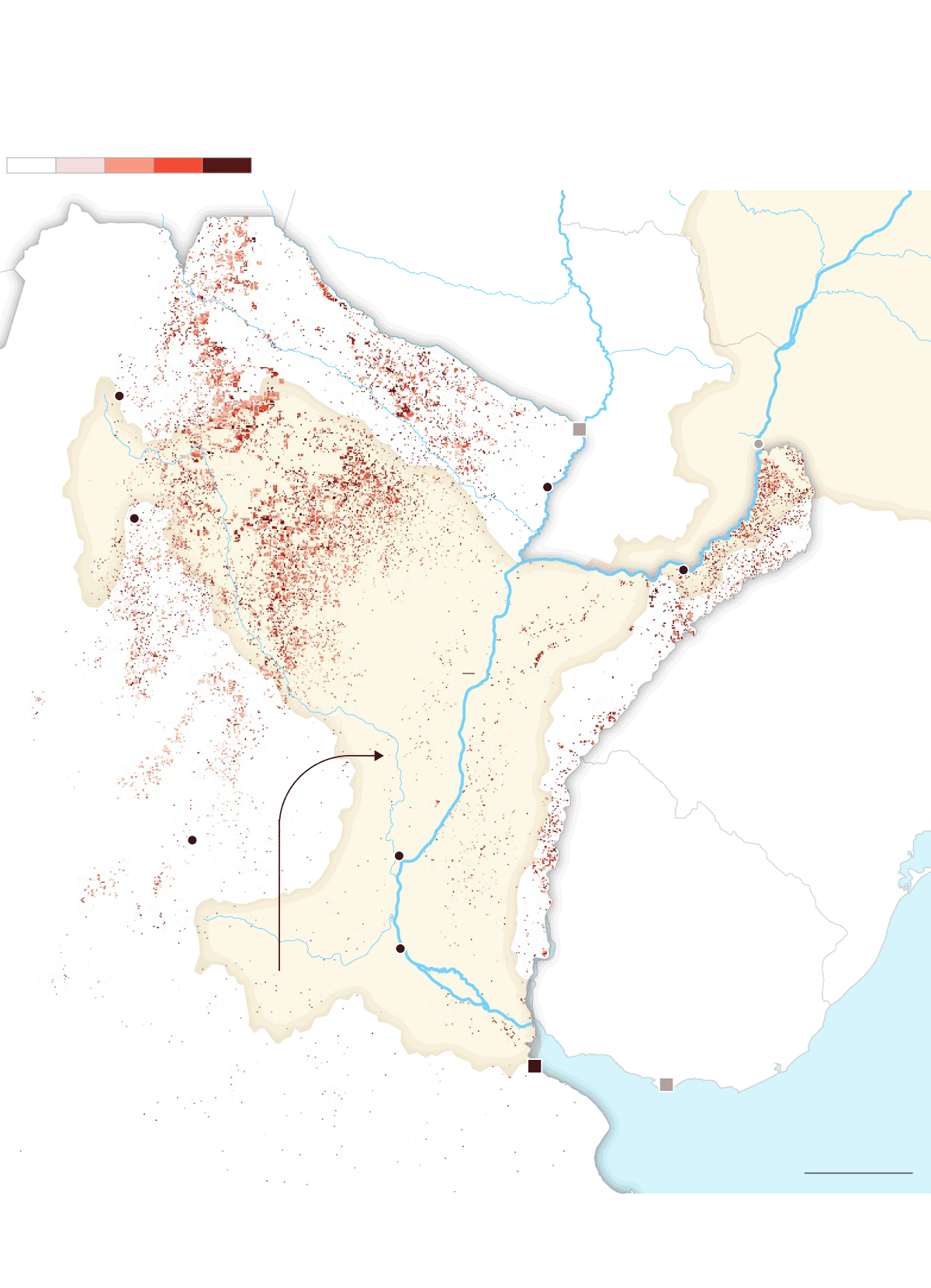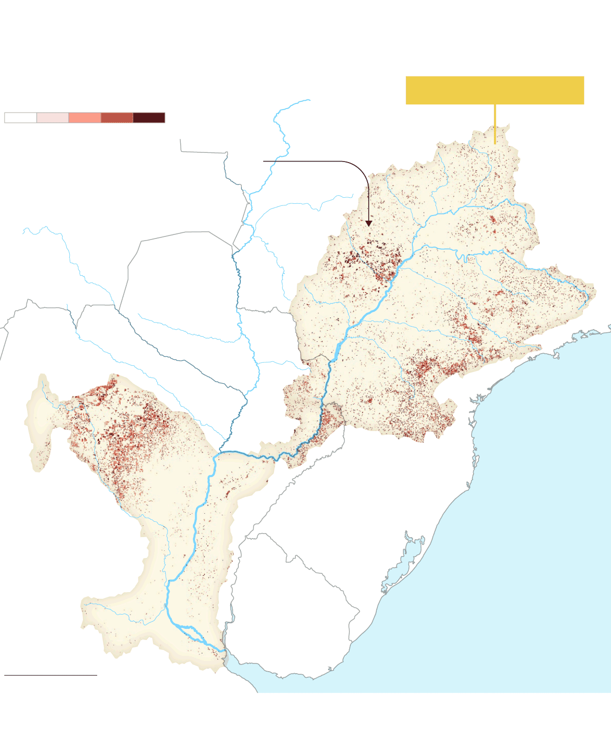 La mancha de la frontera agropecuaria en la cuenca ha alcanzado niveles históricos. Comenzó a expandirse alrededor de 1960 y sigue creciendo sin parar. Hoy es un inmenso espacio de más de 47 millones de hectáreas de agricultura extensiva y al menos 90 millones de hectáreas de pastura de ganado vacuno que ocupan partes de 11 provincias argentinas, siete estados brasileños y ocho departamentos paraguayos. La mayor pérdida de cobertura forestal fue antes de 2001, pero después de ese año, la deforestación continuó imperturbable pese a los discursos y a las políticas globales para frenarla y para disminuir la emisión de gases de efecto invernadero que aumentan la temperatura del planeta.