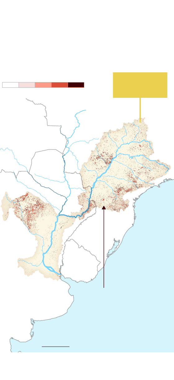 Un estudio de este año del Centro Común de Investigación de la Comisión Europea y el Sistema de Información sobre Sequía para el sur de Sudamérica es categórico: el cultivo extensivo de soja, trigo, maíz y la pastura del ganado vacuno son la causa de la deforestación de la Gran Cuenca del Plata y de su subcuenca, el Paraná. Y va más allá: la última sequía entre 2019 y 2021, que causó una histórica disminución del caudal del río Paraná y sus afluentes, fue agravada por el cambio de uso del suelo y su consecuente deforestación. Eso provocó que se modificara el ciclo de lluvia en la naciente del río, en la cuenca alta del Paraná, ubicada en Brasil.