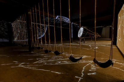 Uno de los trabajos más políticos de la Bienal es presuntamente decorativo, y casi pasa desapercibido. En diversos espacios del CCBA, y en las puertas de entrada de varias salas de video, cuelgan como cortinas unos cordeles coloridos diseñados por el colectivo Da Tribu. Para conocer mejor este proyecto, lo idóneo es trasladarse en barco a la cercana Isla de Cotijuba. En el norte está la playa de Seringal, que toma su nombre del árbol del caucho, la seringueira. Allí, la comunidad Pedra Branca extrae artesanalmente el látex, y con él configura joyas o, en este caso, los cordeles que se muestran en la Bienal.