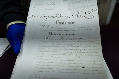 Sobre una mesa han desplegado unas cuantas reliquias: un libro de cuentas del siglo XVII, una carta de 1821 de puño y letra del libertador José de San Martín, la cronología de cómo se modificaron las estrofas del himno nacional, el testamento del antropólogo Julio César Tello, y unas hojas de coca enterradas junto a momias. El valor es incalculable. Un paso en falso sería fatal para documentos que representan el ADN del país. Suficiente daño con habitar un calabozo desde el siglo pasado: que la razón los ilumine.