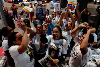 “¡Libertad, libertad, libertad!”, gritaba un grupo de mujeres desde el Helicoide. “Todos van a salir, toda esta lucha se va a acabar. Venezuela va a ser libre, podremos hablar y gritar, tendremos derecho a no tener miedo. Esta es una lucha de todo el país”, aseguraba emocionada Mayra Morales, hermana de Ricardo Fonseca, un militar encarcelado en 2020, implicado en la causa de la Operación Gedeón, y que hace meses fue trasladado de prisión sin que su familia sepa dónde se encuentra en este momento.