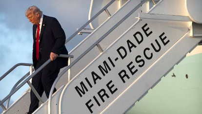 Trump tras bajar del Air Force One, este sábado, en Miami. Foto: AP Photo/Mark Schiefelbein | Vídeo: EPV