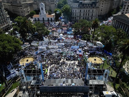 Horas más tarde, los sindicatos de la Confederación General del Trabajo (CGT) protestaron en la Plaza de Mayo para manifestar su desacuerdo con la reforma del régimen laboral que promueve Milei. La iniciativa propone reducir las indemnizaciones por despido y los aportes patronales, flexibilizar las negociaciones salariales, derogar convenios vigentes y limitar el derecho a huelga, entre otras cosas.