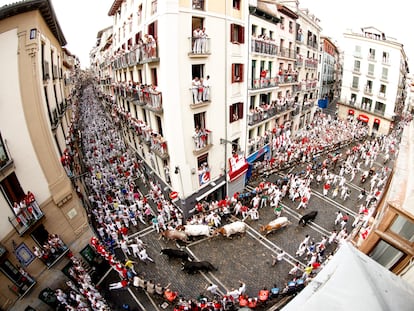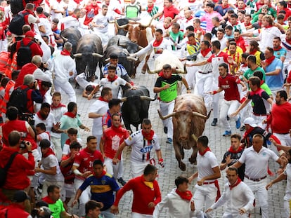 Masificada, rápida y peligrosa carrera de San Fermín con los nobles toros de La Palmosilla