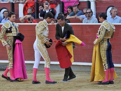 El padre del torero, vestido de calle, bajó al ruedo y presidió el intercambio de trastos en sustitución de Paco Ureña, padrino de la ceremonia