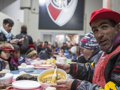 Decenas de personas en situación de calle se acercan al estadio de fútbol en busca de mantas, ropa de abrigo, una cena caliente y cama en una noche gélida