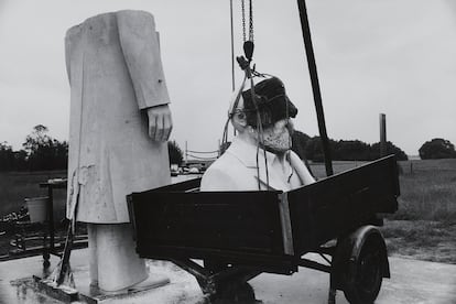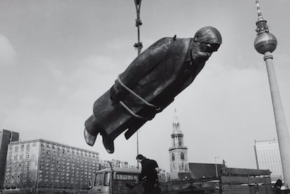 La fotografía captura un instante decisivo: una estatua monumental del filósofo Friedrich Engels ha quedado suspendida en el aire. En el fondo, los bloques de pisos conviven con la torre de la iglesia de Santa María y la Torre de Televisión en el histórico barrio de Mitte, en el Berlín oriental, subrayando el contraste entre el pasado y el presente. Su autora es la fotógrafa alemana Sibylle Bergemann (1941-2010), una de las grandes referencias de la fotografía alemana de las últimas décadas del siglo XX. Vista hoy, la imagen invita a pensar que estamos ante otro documento más del ocaso de un ídolo; a leer la escena como una retirada, la consecuencia de un giro histórico. Sin embargo, la imagen fue tomada durante el proceso de la instalación del Marx-Engels Forum, dedicado a las dos figuras centrales del relato oficial. Un detalle que desarma nuestras primeras certezas y revela hasta qué punto la historia —y nuestra mirada— pueden invertir el sentido de una misma imagen.