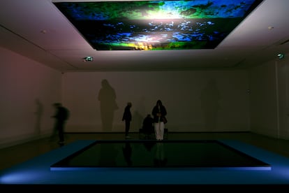 En la parte inferior, se encuentra una piscina circular repleta de agua. Al observar el reflejo de los retratos se gesta casi un infinito vertical como una referencia al mundo superior e inferior Una gota cae al centro, temporizada, aproximadamente, al minuto, generando una expansión del centro del círculo hacia los extremos. “Un ritmo constante que se repite y se hace expansivo, de manera que los elementos visuales refuerzan la idea de la temporalidad y la espacialidad”, añade el autor.
