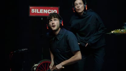 En Si fuera una película, su obra más reciente, Macarena Recuerda abandona la corporeidad para recrear la labor de los efectistas o ruideros, los técnicos que en los radiodramas replican el galope de un caballo golpeando las dos mitades de un coco o recrean el crepitar del fuego apretando una bola de celofán. Con el ocaso del cine mudo, los creadores de estos efectos de sala (o decorados sonoros) se incorporaron al séptimo arte. En esta nueva coproducción con L’Antic Teatre de Barcelona, recién representada en la sala madrileña Réplika Teatro, el público se calza unos cascos para asistir a una función donde los actores están al servicio de los efectos que producen, al revés que en la radio y el cine. Es un puro ejercicio de estilo, un teatro donde se produce una vertiginosa inversión de valores y lo accesorio se vuelve central, como sucede también en A Nublo, de Edurne Rubio y María Jerez.