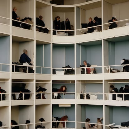 “En el trabajo que desarrolló con la IA hay toda una elaboración de las arquitecturas: no solo de los cuerpos y su estética, sino también de superficies, texturas, luces y espacios. La disposición de los cuerpos dentro de estas estructuras es fundamental. Para esta idea, jugué con la imagen de una colmena, una arquitectura que cruza estanterías, cárceles, colmenas y oficinas convencionales. La serie profundiza en el universo de la logística laboral y lo corporativo, prestando atención a gamas de color, moquetas, cortinas y, especialmente, a la luz: cómo se define y se dispone para iluminar estos espacios de trabajo. En todas las imágenes siempre hay algo fuera de lugar o desbordado, a veces un simple detalle, que remite a lo rutinario, repetitivo y milimétrico que se sale de control, generando fricción y desborde frente a las ordenaciones y legislaciones del Estado, estableciendo mecanismos de contención más que de control”.