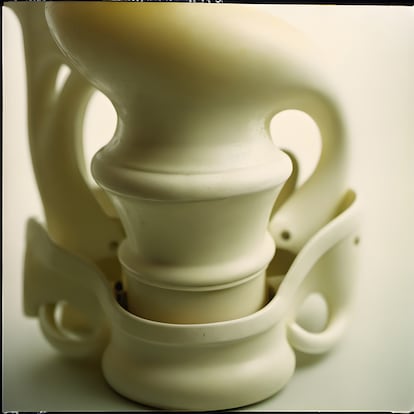 “Nos encontramos ante un plano detalle. Podemos reconocer que se trata de una prótesis o estructura por el material con el que se ha generado. Recuerda a una vértebra, aunque su exactitud científica no es lo importante: funciona como un símbolo de lo que nos está contando. En el contexto del trabajo burocrático, donde las funcionarias alternan entre roles de obediencia y autoridad, los cuerpos sufren un desgaste constante, y estas prótesis representan el apoyo necesario para sobrevivir y sobrellevar un trabajo acumulativo y repetitivo. Me interesaba la idea de la vértebra que une la cabeza con el cuerpo: ese cuello que podría necesitar vértebras extras, imaginando que mantiene la cabeza baja o siempre agachada, pasando todo su tiempo frente a un ordenador o repasando papeles. La imagen transmite así tanto la tensión física como la carga emocional asociada a estas tareas, haciendo visible un desgaste que normalmente permanece invisible”.