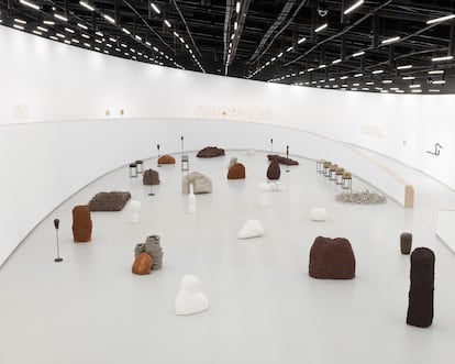 Hay más porqués. La artista italobrasileña de 83 años, condecorada en 2024 con el León de Oro por toda su trayectoria en la Bienal de Venecia, siempre ha hecho gala de una obra que escapa de las direcciones únicas. Su trabajo no es lineal ni cronológico, ni sus intereses ni los medios que emplea. Y así es la exposición, igual de honesta, obstinada y paciente. Agrupa trabajos producidos entre 1975 y 2025: un conjunto de obras que se despliegan creando una red circular en la que las distintas piezas establecen conexiones transversales entre sí, de manera que los significados de un trabajo a otro reverberan y se amplían. Algunos de ellos son la serialidad, la visceralidad y el desbordamiento. Lo pequeño, lo efímero, lo corporal. También los gestos discretos y repetitivos, la acumulación y las metáforas. Lo múltiple abunda, también en los lugares desde los que habla Maiolino. Ese don de la ubicuidad quizá sea reflejo de su experiencia migratoria que tanto ha marcado su producción. Nació en Italia, pasó su infancia en Venezuela, vivió en Argentina y Estados Unidos antes de asentarse en Brasil en los sesenta, donde ha desarrollado su trabajo. La artista habla desde la física cuántica cuando busca poetizar la energía invisible de los vacíos activos, desde la magia al pensar que la vida se renueva en los huecos de la tierra y desde lo popular cuando busca raíces en lo existencial del arte y su contribución revolucionaria en nuestro campo sensible.