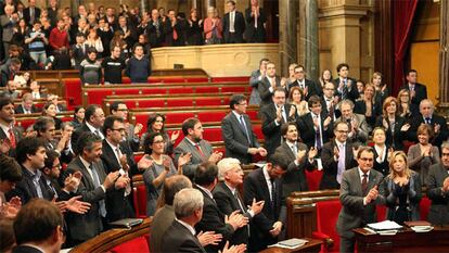 La divisió entre els dos grans partits de Catalunya, Convergència i Unió i el Partit dels Socialistes, va marcar ahir el que havia de ser una jornada històrica al Parlament. La Cambra catalana va aprovar per àmplia majoria, amb 85 vots a favor (CiU, Esquerra, Iniciativa i un diputat de la CUP), 41 en contra (PSC, Partit Popular, Ciutadans) i dues abstencions (CUP), el text que proclama la “sobirania jurídica i política del poble català”. La resolució marca el camí cap a la consulta sobre l'autodeterminació, fixada per 2014. La data no es concreta en el text, que tampoc soluciona l'encaix legal de la votació. Sosté que “s'utilitzaran tots els marcs legals existents per fer efectiu l'exercici del dret a decidir”. La proclamació subratlla que es buscarà el diàleg amb l'“Estat espanyol, les institucions europees i el conjunt de la comunitat internacional” per legitimar el procés.