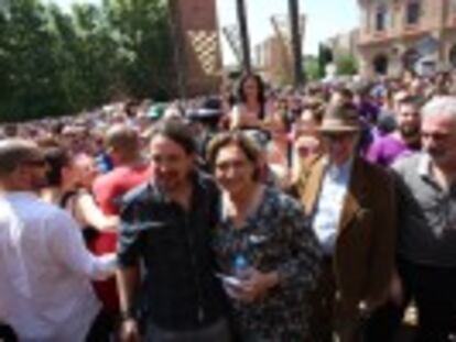 Josefa Piñeiro, de 79 anys, vestida tota de negre –“sóc vídua”–, confirma que la sensació que té en l’acte és la mateixa que tenia durant la transició. “Però jo no votava el PSOE, jo votava més a l’esquerra. Ara vull el Pablo, com tota la meva família”, explica aquesta catalana d’origen gallec sota els arcs de la plaça. En un jardí proper hi ha una cua de parelles que esperen per casar-se a la seu del districte, acompanyats per familiars i els crits d’Iglesias. Maite Rodríguez i Antonio Díaz són un matrimoni de jubilats de Nou Barris. Ella és una professora d’escola bressol jubilada, ell treballava a la indústria siderúrgica; per protegir-se el cap del sol, Díaz porta una gorra de l’empresa Würth. Rodríguez lamenta que la seva escola, pública, hagi passat a estar gestionada per una empresa privada. Díaz creu que s’estan perdent els serveis públics que van requerir tants anys de lluita. Díaz assenyala certa gent del públic amb les samarretes violetes de Podem i assenyala Iglesias. Tots aixequen el puny, destaca Díaz, “com feia l’esquerra. Esprem que quan l’obrin, no caiguin monedes”.