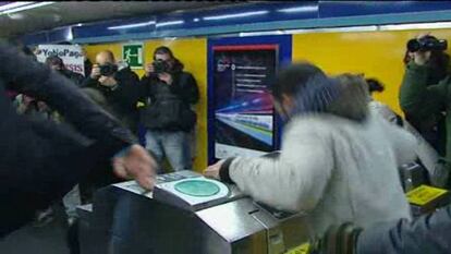 Al llegar a la estación de metro de Tirso de Molina, donde no había presencia policial, medio centenar de personas se coló al grito de "¡Yo no pago ni su crisis ni su deuda!", "que pague Urdangarin", "que pague Botella", y animaron a los usuarios a no pagar.
