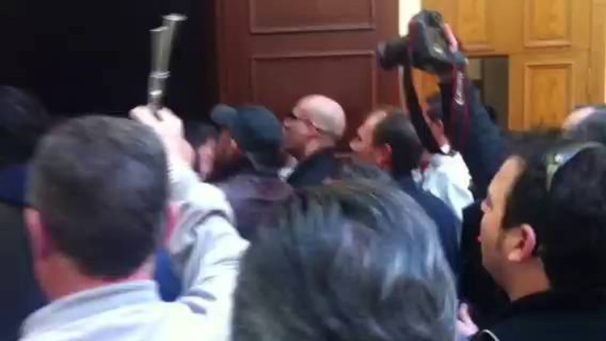 Cuando se han cumplido las 10.30, hora prevista del consejo, los trabajadores han penetrado en la sede y han subido por las escaleras hasta la misma sala profiriendo gritos contra la rebaja salarial, los “engaños” de Grau y pidiendo la dimisión de Anfonso Novo, concejal de Transporte del PP y presidente del consejo de administración de la EMT y del gerente de la empresa. Tras varios minutos impidiendo el inicio de la reunión, la mayoría de los trabajadores se ha ido retirando de la escalera hasta volver a concentrarse en la plaza del Gobernador Viejo. "Compañeros, vamos hacia atrás para demostrar que los trabajadores apostamos por la negociación  el diálogo", decía un hombre con megáfono en ristre.