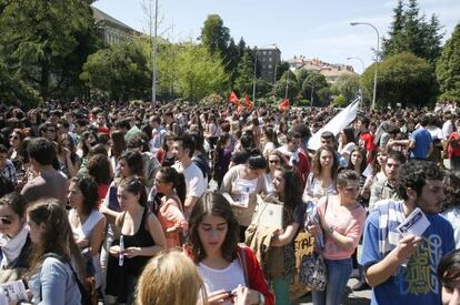 Miles de estudiantes de enseñanza media y universitaria de Galicia se han manifestado este jueves por las calles de Santiago contra de las medidas de ajuste del gasto en educación llevadas a cabo por el Gobierno, coincidiendo con la jornada de huelga en ambos niveles educativos. La marcha, que salió de la plaza de O Toural de Santiago hacia el mediodía, discurrió hasta los edificios de la Xunta en San Caetano.
