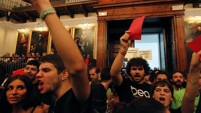 El clima de contestación social que vive la universidad pública española, en general, se ha trasladado este viernes a la apertura institucional de curso en la Universitat de València. En medio de fuertes medidas de seguridad, un centenar de alumnos y profesores —que habían protagonizado sentadas y pitadas en las puertas de la sede antigua de La Nau— ha logrado entrar e interrumpir durante un cuarto de hora la ceremonia, en la que el rector Esteban Morcillo alertó del peligro que conlleva la “sustancial” subida de tasas del 20%. Morcillo ha reafirmado su rechazo, en sintonía con lo expresado por la Conferencia de Rectores de Universidades Españolas, y avisa de que el incremento de matrícula genera “riesgos potenciales de exclusión de los estudios universitarios y tampoco supondrá una mejora del financiamiento del sistema universitario”.