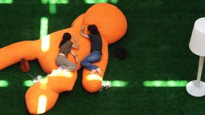 Meterse en esa casa encendida es un poco como bucear en Internet. Si uno empieza por desayunar en el sofá customizado por el artista Ryan McGuiness de la cafetería, donde Macarena prepara como nadie los molletes tostados con tomate y aceite (2,30 euros el desayuno), es difícil no mirar, al paso, hacia la puerta de la sala A, donde ahora acaba de inaugurarse la exposición de Luois Bourgeois. Y, al salir, cuesta no asomarse a la ventana que da al patio interior. Y, buscando el origen de tanta luz, se encuentra uno subiendo a esa magnífica terraza-azotea en la que lo mismo se toma el sol, se escucha música sobre los tejados de Madrid o se prueba el arte de la jardinería. Y, al bajar, la curiosidad nos asoma a la biblioteca-mediateca y, sin querer, nos sorprendemos husmeando en esa impresionante colección de jazz —5.000 discos de vinilo y 6.000 CDs— que Carmen Navajas, la viuda del crítico Federico González, regaló en su día tras enviar un escueto mensaje: “Tengo algo que os interesa”. Y, con la sensación de haber descubierto un tesoro, cómo no cotillear y ver quién hay en el laboratorio fotográfico y en la sala de radio, justo al lado de la de los talleres de idiomas. Es entonces cuando se imagina la anécdota que recuerda Guirao: “Vino John Berger [pintor y escritor] y estuvo ensayando la reconstrucción de la performance sobre el escultor Juan Muñoz con un mago y un especialista de sonido y decía que lo que más le gustaba era escuchar las voces de los inmigrantes del barrio que estudiaban español en el aula de al lado, gentes de otras culturas intentando meterse en la nuestra”.