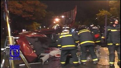 Los bomberos del Ayuntamiento tuvieron que sacar por el techo al conductor del vehículo que quedó volcado y a su acompañante. Rápidamente el personal del Samur logró sacar de una parada cardiorrespiratoria al conductor, de 24 años, que presentaba un traumatismo craneoencefálico muy grave y fue conducido al Hospital Clínico. El copiloto, de 25 años, que tenía traumatismo craneoencefálico y torácico fue trasladado, intubado e inconsciente, al Hospital de La Paz.