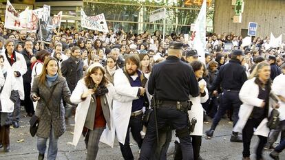 Los manifestantes han acudido convocados por redes sociales y avisados desde los encierros que el personal sanitario protagoniza en ambulatorios y hospitales desde que el Gobierno regional anunció sus nuevos planes para la sanidad madrileña. Hay médicos, vecinos, auxiliares y personal no sanitario. Un peón de mantenimiento del instituto psiquiátrico José Germán de Leganés, según lo han identificado después sus compañeras, ha sido detenido frente a una de las puertas laterales del hemiciclo regional tras saltarse el cordón policial y forcejear con varios agentes. “¡Es mi compañero, va detenido!”, balbuceaba junto a la verja la mujer que lo acompañaba, que ha asegurado que “le habían dado una paliza” mientras intentaban retenerlo entre varios agentes. Ha sido detenido por atentado a la autoridad y desobediencia, según la versión policial.