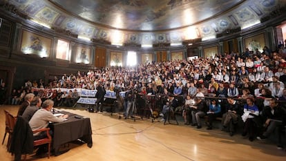 “¡Sí se puede, sí se puede!”, coreaban este jueves los sanitarios reunidos en una multitudinaria asamblea en el Colegio de Médicos de Madrid. Estaban allí para decidir si seguían adelante con la propuesta de la dimisión en bloque en los centros de salud y cómo llevarla a cabo, es decir, cuántas dimisiones serían suficientes para conseguir el objetivo de presionar al Gobierno regional. El órdago no sería tal si finalmente solo daban el paso una decena de directores. Sin embargo, la carta de renuncia llevaba días redactada y circulando por los correos electrónicos de los sanitarios. Muchos de los asistentes ya la llevaban firmada cuando llegaron al anfiteatro del colegio. Las fueron dejando sobre la mesa. Mientras intervenían médicos y enfermeros —“Gracias, Lasquetty, por unirnos”, exclamó uno— y se decidía que una mayoría simple (la mitad más uno de los 270 centros, es decir, 136) sería suficientemente representativa, un recuento sobre la marcha dio como resultado que 118 centros de salud ya habían firmado.