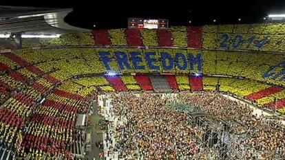 Era aún de día, y bajo el sol era más perceptible que, por una vez en su historia, el Camp Nou no era azul y grana, sino amarillo y rojo senyera. El público, a las 20:00 horas ya en sus localidades, se preparaba para la fiesta, que con solo cinco minutos de retraso comenzó con música, con una sardana. Sí, música, siempre la música, esa eterna olvidada de la política cultural y de las disposiciones municipales que sin embargo siempre es reclamada cuando se desea concitar voluntades, emociones, anhelos, masas. Y en esos casos la música acude, los músicos olvidan agravios, ejercen de sanadores y sus canciones cosen voluntades con el hilo de la melodía. La de la sardana Juny comenzó ayer la fiesta en el Camp Nou, una fiesta reivindicativa y desinhibida que se prolongó más de cinco horas. Podrían haber sido ocho, nadie se hubiese quejado, las buenas bodas no deberían acabar nunca.